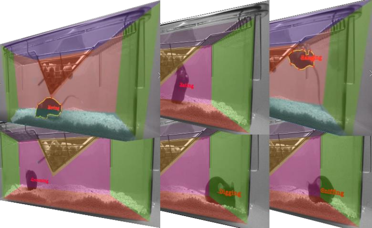 1.自动识别动物在饲养笼内的位置信息、站立、蹲坐、理毛、嗅探、挖掘、不动、慢速运动、快速运动、吊挂、饮食、饮水等行为。